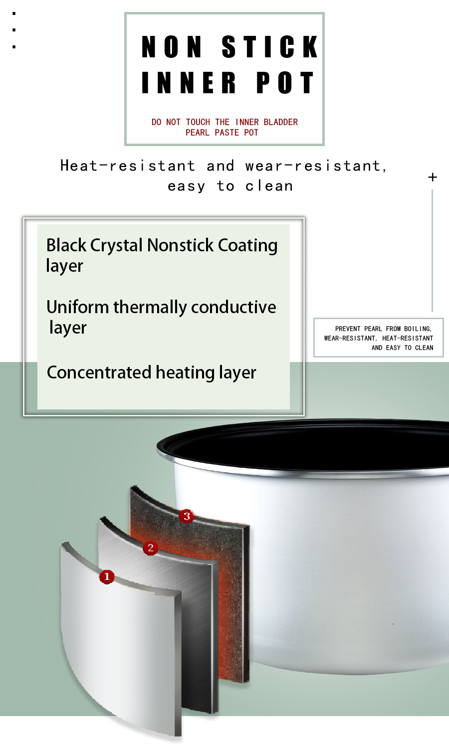 8. The cooker comes with a dual-spray non-stick coating on the inner pot, preventing the pearls from sticking. The inner pot also features a handle for easy portability.