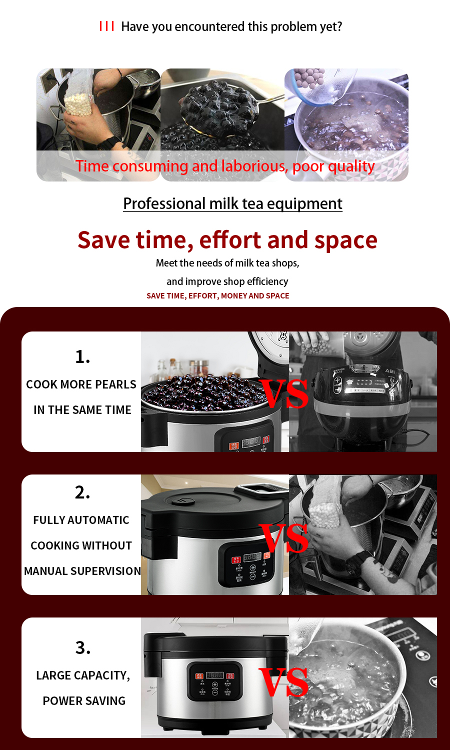 1. Designed to perfectly cook both Black Pearls and Boba Pearls, our cooker ensures that each pearl is distinct, crystalline, and free from clumping.